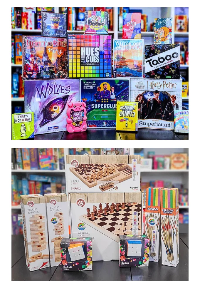 L’offerta comprende un’ampia selezione di giochi, con oltre 500 giochi a disposizione da poter provare in negozio e più di 2000 titoli in vendita! Dai giochi da tavolo ai giochi educativi, dalle attività creative alle proposte per il gioco condiviso, ogni prodotto è scelto con attenzione per garantire qualità, sicurezza e valore educativo. La varietà dell’assortimento consente di trovare sempre il gioco giusto, sia per il divertimento individuale sia per l’esperienza di gruppo.
